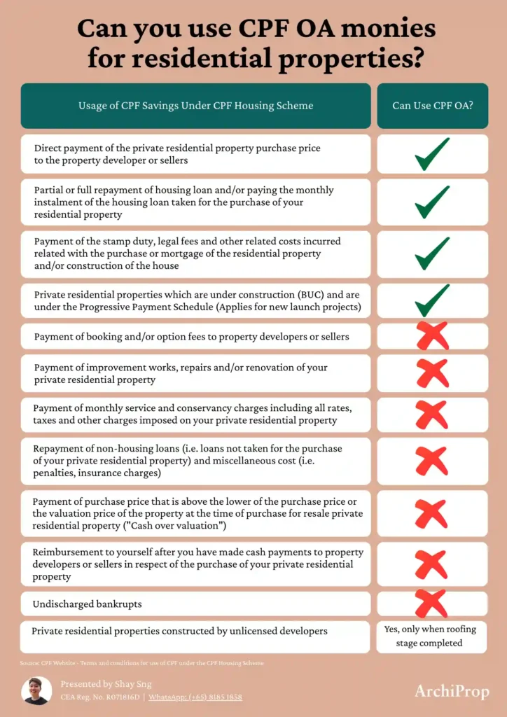 There’s a CPF Housing Scheme which governs how and whether you can use your CPF OA savings when purchasing a residential property. The table below shows the specific allowable or non-allowable uses of CPF OA savings with regard to buying a new launch residential property.