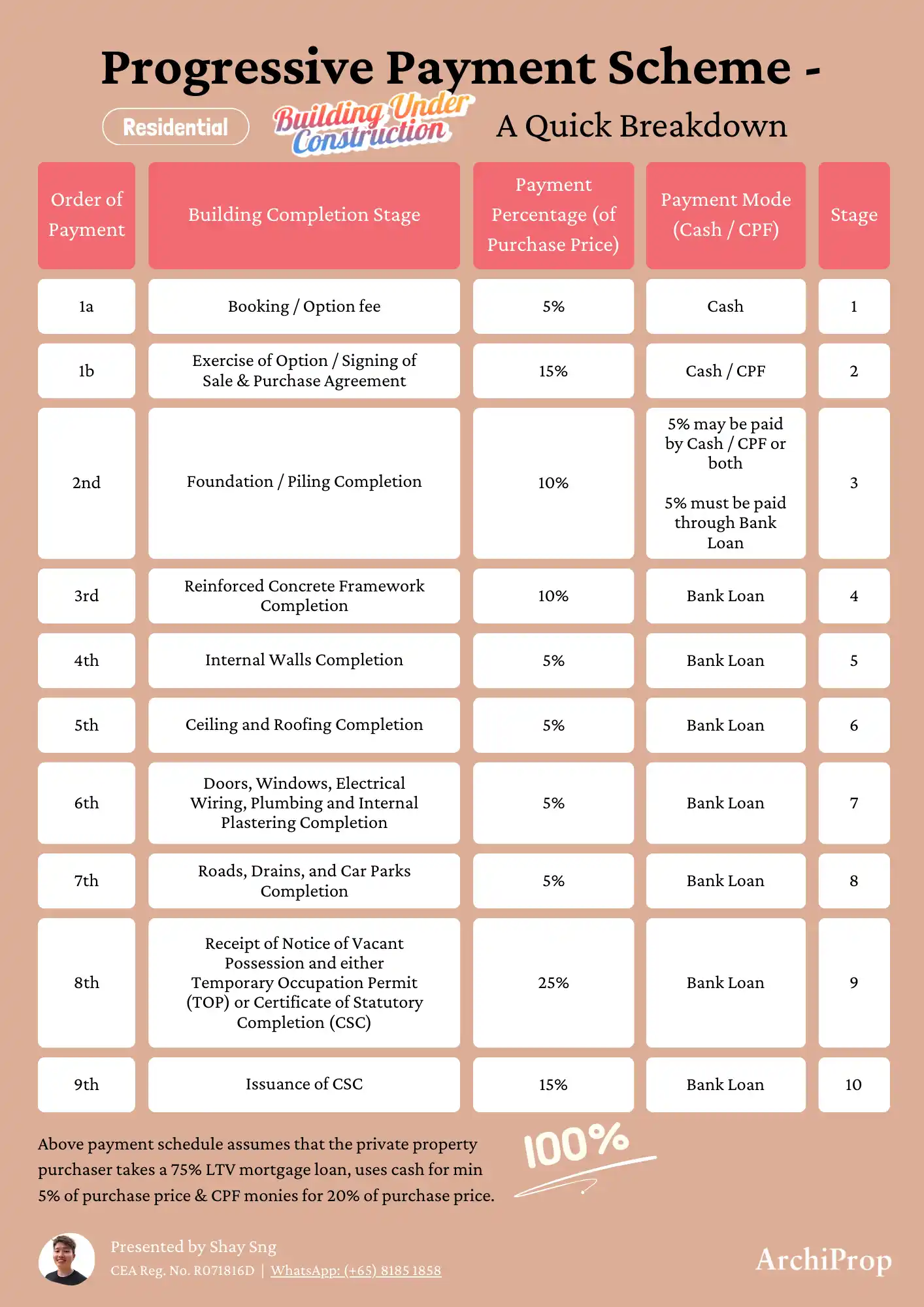 Each stage correlates with specific construction progress, giving you control over your investment timing. The table below outlines clearly the respective stages and percentages of payment during the construction process. It’s based on the scenario where you will be taking a 75% LTV of the property price as the bank loan (which means 25% to be paid in cash or CPF.